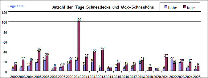 | Datum | Schneehöhe in cm | Wetter | Tagesmittel | Temperatur |